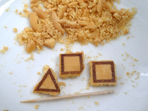 その後、娘がビスケットをほしがるのであげたら、つまようじを使って器用に型抜きをしていましたよ。