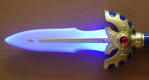 とりあえず電池を入れてスイッチをオンにしたら、刀身の部分が青く光りましたよ!